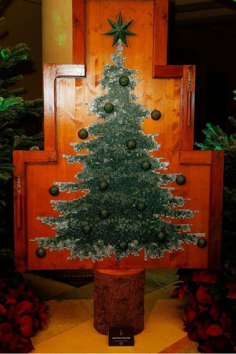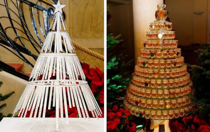 Ливанский модный дизайнер Эли Сааб признанный творец великолепных женских платьев , потрясающих , летящих. Елка представленная этим дизайнером сделана из флаконов духов, выпущенных под его именем. Очень просто и лаконично.....
